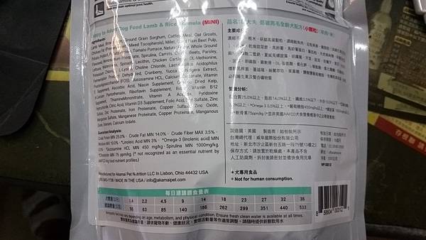 濃縮羊肉、糙米、研磨高粱穀粒、濃縮鯰魚肉、去殼燕麥、雞肉脂肪(與維